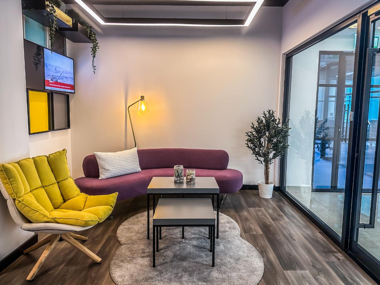 There is a purpose-built demo lounge for the four communication team to invite their potential clients in for experience days. The breakout area is designed to offer space for the 50+ team to relax and refuel. It doubles a screening room for four agency to watch their clients work. The four agency brand emanates the space through imagery of streaming icons and through the branded living moss wall.