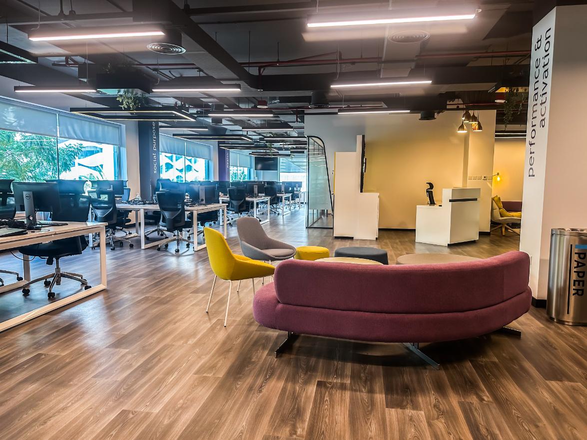 Four Agency helps the best companies in the world to deliver, measure and protect their entertainment streaming services. Due to their ongoing success, they acquired an additional 6,000 sq ft within their current building at their Dubai head office in Media City. Whitemonde were appointed to design and fit the new and existing spaces. Our brief was to create a fresh, welcoming and collaborative workplace that tells the four agency story and celebrates their success stories. To support the growth and development of the existing team and attract and retain new team members.